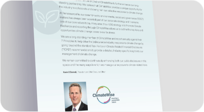 Foreword This year, I accepted the role of Chair of ClimateWise to further enhance our long- standing partnership. We believe that ClimateWise provides a unique opportunity for the industry to collaborate and strengthen our collective response to climate change. At RenaissanceRe, our commitment to environmental, social and governance (“ESG”) matters has always been a central part of our corporate strategy, and it remains one of our core values today. A key area of our ESG strategy is to Promote Climate Resilience and reporting through ClimateWise allows us to outline the key risks and opportunities climate change poses to our business. We are a long-standing member of ClimateWise and report annually against their 7 Principles to help drive the (re)insurance industry response to climate change by going beyond the standard Task Force on Climate-Related Financial Disclosures (“TCFD”) recommendations to provide a detailed, industry-specific insight into our management of climate change. We remain committed to continuously enhancing both our public disclosures in this space and the many ways in which we manage our exposure to climate-related risks. Kevin O’Donnell, President and Chief Executive Officer Page 2