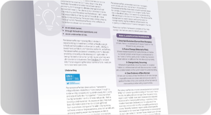 Principle 3 - Lead in the identification, understanding and management of climate risk 3.1 Ensure processes for identifying, assessing, and managing climate-related risks and opportunities are integrated within the organization (including investments). One important aspect of RenaissanceRe’s corporate RenaissanceRe’s underwriters and risk managers purpose is the role the Company plays in helping work closely with the internal team of scientists at facilitate the world’s transition to a lower-carbon RenaissanceRe Risk Sciences to build nuanced views economy. Anthropogenic climate change is both an for climate change’s impact on a range of perils. Each existential threat to the planet and an imminent risk to risk is classified using a framework for understanding the industry, and RenaissanceRe believes that it bears climate impacts. Across this framework, RenaissanceRe the responsibility of being part of the solution. As a recognizes that each region-peril combination is reinsurance company, there are three primary means categorized to highlight relative differences in the through which RenaissanceRe can help effectuate urgency and likelihood of material changes in the risk. transition to a lower-carbon world: RenaissanceRe’s framework consists of four key • as an asset owner; categories that are used to classify each risk: • through its business operations; and • as an underwriter of risk. RISK CLASSIFICATION FRAMEWORK 1. Uncertain Evolution (Current View Remains): RenaissanceRe has made significant strides in Where there is no evidence of future impact or the decarbonizing its investment portfolio while also using it impact is very uncertain. to facilitate the transition to a low-carbon world. Utilizing its 2. Future Change (Material to Risk): investment portfolio to promote a low-carbon future furthers Where research points to future change, a timeline RenaissanceRe’s purpose of protecting communities and is created to track when impacts are expected to enabling prosperity, while also supporting its vision of be material for that peril, whilst monitoring trends in being the best underwriter by helping reduce long-term observations to calibrate the risk view appropriately. climate risk to its business. See Principle 4 for detailed information regarding RenaissanceRe’s efforts in relation 3. Change Likely Occurring: to its business operations. Where change is likely occurring based on physical models but where observational data are sparse, models Underwriting are updated based on the current scientific understanding. 4. Clear Evidence of New Normal: Where perils already show the effects of climate change, physical models and observational data are used to update the view of risk, and carefully refine that view as new events provide tuning opportunities. RenaissanceRe has taken various measures to mitigate losses related to climate change through its RenaissanceRe’s risk models are evaluated and updated underwriting process and by continuously monitoring in light of its evolving understanding of micro and macro and adjusting its risk management models to reflect trends, including climate change. Over the years many the higher level of risk that it thinks will persist. Before region-peril models have been reviewed and adjusted binding a (re)insurance risk, exposure data, historical to account for changing climatology. In addition, many loss information and other risk data is gathered models have been reviewed and not adjusted if the from customers. Using a combination of proprietary science and data did not offer compelling evidence to software, underwriting experience, actuarial techniques do so. Recently reviewed region-perils where specific and engineering expertise, the exposure data is increases in risk have been implemented or are expected reviewed and augmented, as deemed appropriate. to be implemented in the near future, based upon climate RenaissanceRe uses this data as primary inputs into change considerations include U.S. hurricane, California the REMS© modeling system as a base to create risk wildfire, Australia wildfire, European Union flood, and distributions to represent the risk being evaluated. A key North American severe convective storms. advantage of RenaissanceRe’s REMS© framework is its ability to include additional perils, risks and geographic During 2022, RenaissanceRe created a new role of areas that may not be captured in commercially Global Head of Climate and Sustainability Strategy, available natural hazards risk models. As a result, responsible for designing, executing, and coordinating RenaissanceRe believes that it is able to incorporate RenaissanceRe’s climate and sustainability underwriting the risk of an increase in the frequency and severity strategy. This role will lead the development of new of natural catastrophes due to climate change more products and tools to respond to the emerging comprehensively than commercially available models. underwriting opportunities resultant from climate change. Page 10