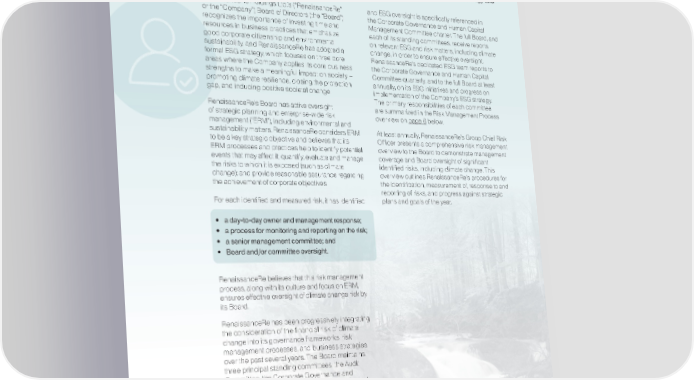 Principle 1 - Be Accountable 1.1 Ensure that the organization’s Board is working to incorporate the Principles into business strategy and has oversight of climate risks and opportunities. RenaissanceRe Holdings Ltd.’s (“RenaissanceRe” and ESG oversight is specifically referenced in or the “Company”) Board of Directors (the “Board”) the Corporate Governance and Human Capital recognizes the importance of investing time and Management Committee charter. The full Board, and resources in business practices that emphasize each of its standing committees, receive reports good corporate citizenship and environmental on relevant ESG and risk matters, including climate sustainability, and RenaissanceRe has adopted a change, in order to ensure effective oversight. formal ESG strategy, which focuses on three core RenaissanceRe’s dedicated ESG team reports to areas where the Company applies its core business the Corporate Governance and Human Capital strengths to make a meaningful impact on society — Committee quarterly, and to the full Board at least promoting climate resilience, closing the protection annually, on its ESG initiatives and progress on gap, and inducing positive societal change. implementation of the Company’s ESG strategy. The primary responsibilities of each committee RenaissanceRe’s Board has active oversight are summarized in the Risk Management Process of strategic planning and enterprise-wide risk overview on page 6 below. management (“ERM”), including environmental and sustainability matters. RenaissanceRe considers ERM At least annually, RenaissanceRe’s Group Chief Risk to be a key strategic objective and believes that its Officer presents a comprehensive risk management ERM processes and practices help to identify potential overview to the Board to demonstrate management events that may affect it; quantify, evaluate and manage coverage and Board oversight of significant the risks to which it is exposed (such as climate identified risks, including climate change. This change); and provide reasonable assurance regarding overview outlines RenaissanceRe’s procedures for the achievement of corporate objectives. the identification, measurement of, response to and reporting of risks, and progress against strategic For each identified and measured risk, it has identified: plans and goals of the year. • a day-to-day owner and management response; • a process for monitoring and reporting on the risk; • a senior management committee; and • Board and/or committee oversight. RenaissanceRe believes that this risk management process, along with its culture and focus on ERM, ensures effective oversight of climate change risk by its Board. RenaissanceRe has been progressively integrating the consideration of the financial risk of climate change into its governance frameworks, risk management processes, and business strategies over the past several years. The Board maintains three principal standing committees: the Audit Committee, the Corporate Governance and Human Capital Management Committee (formerly the Compensation and Corporate Governance Committee), and the Investment and Risk Management Committee. During 2021, RenaissanceRe formalized its Board committees’ oversight of ESG matters (including climate change) within its charters. Climate change was identified as a key financial risk overseen by the Investment and Risk Management Committee Page 3
