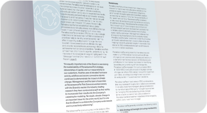 Principle 2 - Incorporate climate-related issues into our strategies and investments 2.1 Evaluate the implications of climate change for business performance (including investments) and key stakeholders. RenaissanceRe’s principal economic exposures Investments arise from its coverages for natural disasters and RenaissanceRe’s primary investment objective is to catastrophes. RenaissanceRe believes (and believes make informed investment allocation decisions that the consensus view of current scientific studies preserve capital, support its business obligations, substantiates) that changes in climate conditions, and maintain its sustainable and diversified position primarily global temperatures and expected sea levels, across market sectors. To further the sustainability of have increased, and are likely to continue to increase, its investment portfolio, RenaissanceRe considers the severity and frequency of weather-related natural environmental, social and governance factors within its disasters and catastrophes relative to the historical investment strategy. RenaissanceRe considers ESG experience over the past 100 years. Accordingly, factors such as climate change to be an important RenaissanceRe has established robust global and growing influence in its investment process that processes to continually assess how climate change ultimately contributes to its assessment of value, could impact different segments of its business. sustainability and return. Management believes that RenaissanceRe considers ERM to be a key strategic incorporating these factors into its analysis makes objective and believes that its ERM processes and RenaissanceRe better positioned to identify attractive practices help to identify potential events that may and sustainable investment opportunities while also affect it; quantify, evaluate and manage the risks helping to identify potential long term downside risks to which it is exposed (such as climate change); related to ESG considerations such as climate and and provide reasonable assurance regarding the carbon transition readiness. achievement of corporate objectives. RenaissanceRe’s embedment of climate change risk understanding into RenaissanceRe recognizes that the relevance and the core of its corporate strategy is highlighted in the materiality of ESG-related factors such as climate ‘Message from the Chair’ section of its 2020 Annual change can vary across asset classes and sectors. In Report, page 8: order to further the incorporation of ESG factors and principles and to enhance its process for identifying, “An equally important role of the Board is overseeing assessing and prioritizing climate change risk, the sustainability of RenaissanceRe’s strategy, RenaissanceRe engaged third party provider MSCI stewardship of capital, and our responsibility to in 2020. MSCI conducts analysis to highlight climate our customers. Another year of elevated hurricane change and others ESG-related risks within investment activity, wildfires and severe convective storms portfolios, providing data insights such as carbon continued to demonstrate the impact of climate intensity to inform future investment decisions. change. Management and the team of scientists RenaissanceRe embeds relevant ESG considerations at RenaissanceRe Risk Sciences worked closely into the processes through which it selects and oversees with the Board to explain the industry-leading third-party investment managers, giving consideration research they have conducted as well as their ability to the robustness of third-party managers’ approaches to incorporate their results into the Company’s to managing ESG risk (including climate change) catastrophe modeling. No doubt, climate change is in the broader context of their ability to deliver on an important issue for the entire world, but it is one RenaissanceRe’s investment objectives. When engaging that the Board is confident the Company understands a third-party investment manager. and is proactively addressing”. RenaissanceRe conducts group-wide analysis of the RenaissanceRe generally considers the following topics: financial risks of climate change across its business, • ESG Strategy & Oversight (including membership working with representatives from investments, risk, of UN PRI); underwriting, facilities, IT and strategy functions to review • ESG Integration & Analysis; current activities and assess the financial risks arising • ESG Governance & Engagement; from the group’s operations. This continuous assessment • Climate Change Risk Oversight (including allows RenaissanceRe to identify operational areas reporting against the TCFD); and where the development of data, techniques and • Commitment to Diversity, Equity & Inclusion. processes could enhance its risk understanding. Page 6